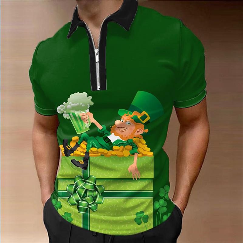 St.Patrick's Day Men's Polo Shirt Golf Shirt Zip Polo Cartoon Saint Patrick Day St. Patrick's Day Clover Turndown Green Outdoor Street Short Sleeves Zipper Print Clothing Apparel Fashion Designer