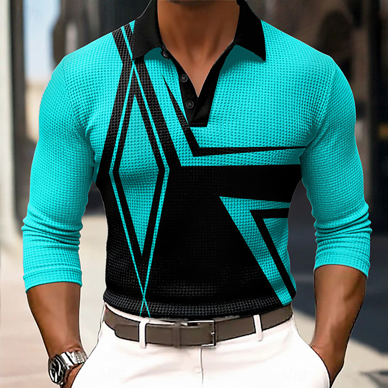 Men's Geometic Waffle Polo Shirts Long Sleeve Polo Shirts Collared Shirts Business Casual Business Wear to work Daily Wear Buttons Spring Fall Winter Blue Red Green
