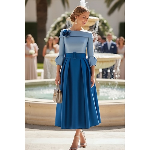 Linea ad A Lunghezza Tè Vestito da Festa Abito da Cocktail Abito da invitata a nozze Abito da cerimonia per signora Manica 3/4 Scollo a Barca Elegante Vintage Cocktail Formale Ospite di nozze Raso con