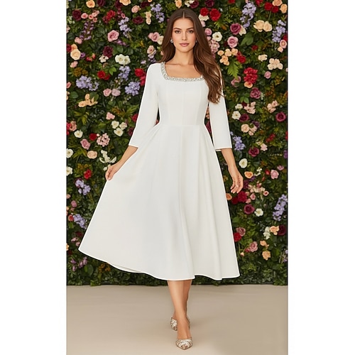Linea ad A Lunghezza Tè Abito da Ballo Vestito da Festa Abito da Cocktail Abiti da sposa Abito da sposa Elegante Vintage Piccoli Abiti Bianchi Manica 3/4 Scollo Tondo Laurea Compleanno con Cristalli