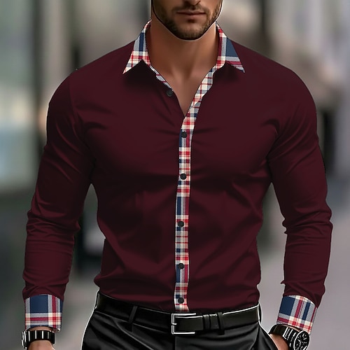 Herren Geometrisch Farbblock Karo / Karomuster Hemd Satinhemd Kleidhemd Langarm Modisch lässig Urlaub Alltagskleidung Sommer Frühling Herbst Umlegekragen 3D-Druck Hemden mit Knopfleiste Rote Purpur