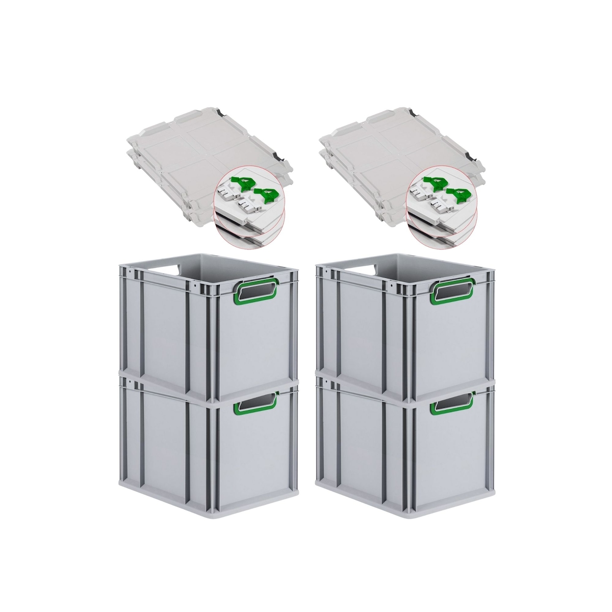PROREGAL 4x Eurobox NextGen Color mit Scharnierdeckel & Verschlüssen | HxBxT 22x30x40cm | 30 Liter | Griffe grün offen | Glatter Boden