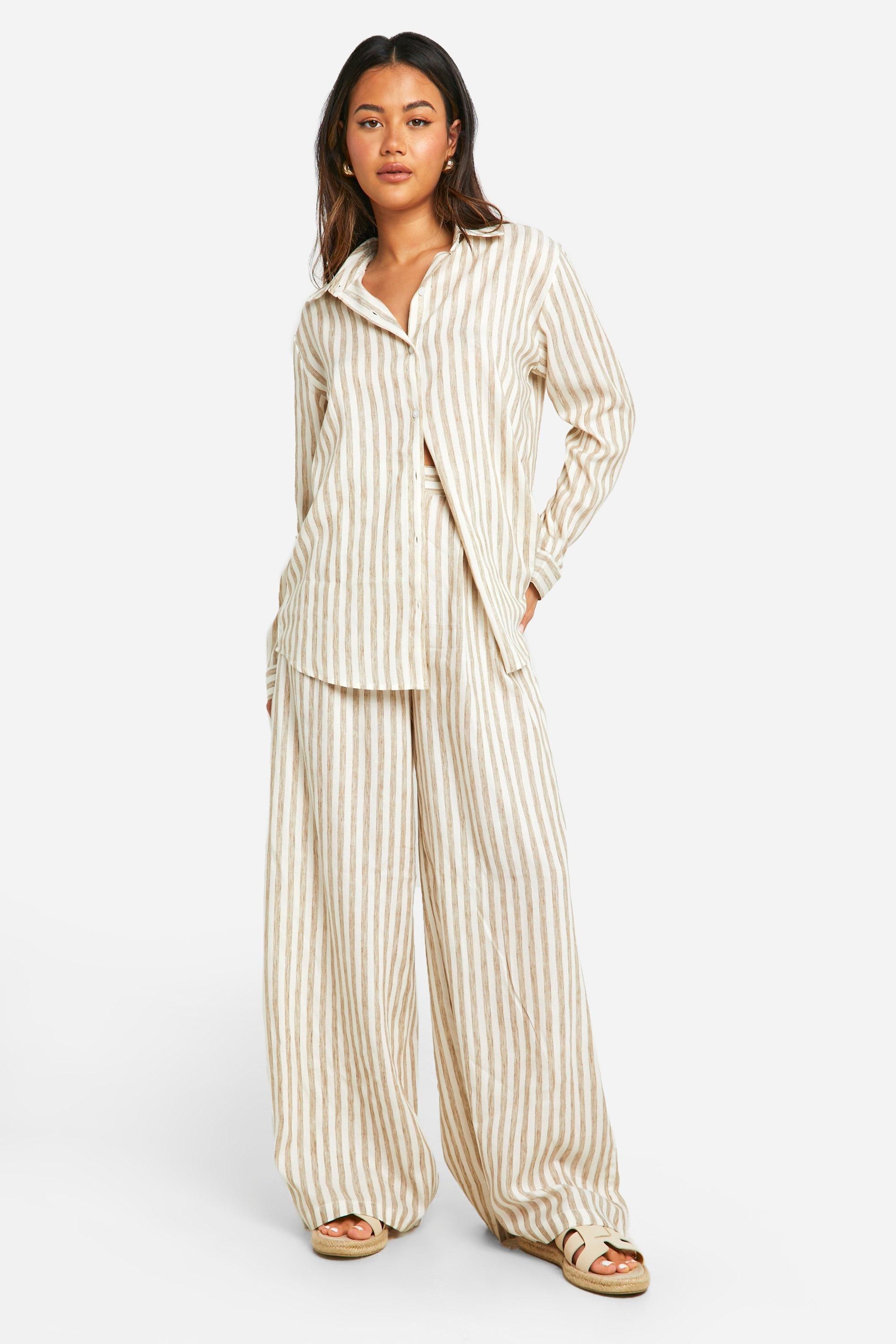 Boohoo Womens Stripe Linen Look Wide Leg Trousers - Ecru Cotton - Size 16 UK | Boohoo Sale | Discount Designer Brands