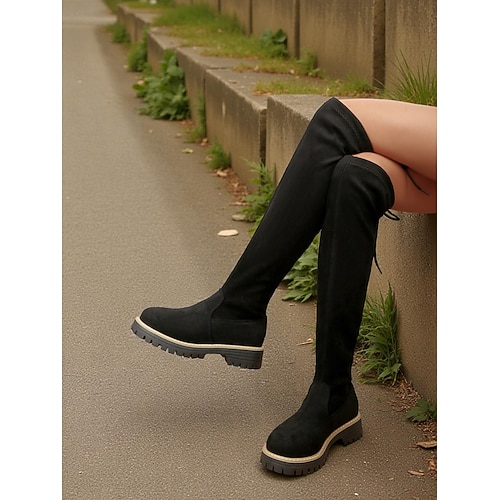 Schwarze Overknee-Stiefel aus Kunstleder mit dickem Absatz für Damen – stylische hohe Stretch-Stiefel für Streetwear im Herbst und Winter, Partys und zum Ausgehen