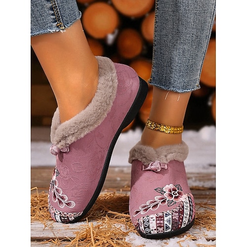 scarpe slip-on da donna con fodera in pelliccia ricamata rossa e motivo floreale, calde scarpe invernali per Natale, periodo festivo e abbigliamento casual