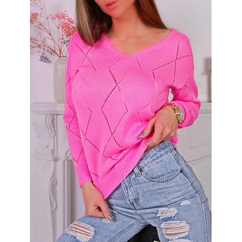 Damen Pullover Lässig Weich Einfarbig Gerippt V Ausschnitt Gestrickt Loch Langarm Normale Oberteile Stricken Outdoor Täglich Wochenende Blau Weiß Frühling Herbst