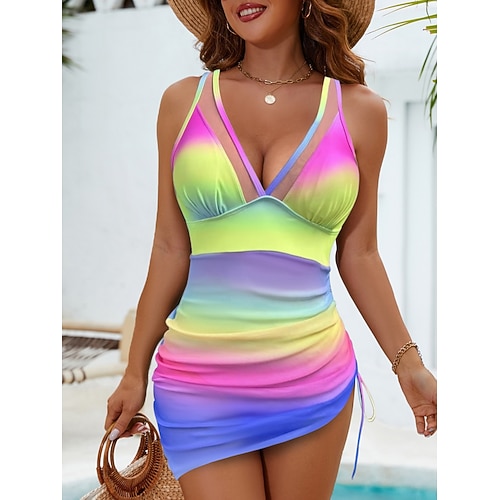 Damen Bikini 2-teiliger Badeanzug Rock Slim Rückenfrei Urlaubs Strandbekleidung Gestreifter V-Ausschnitt Ärmelloser Badeanzug