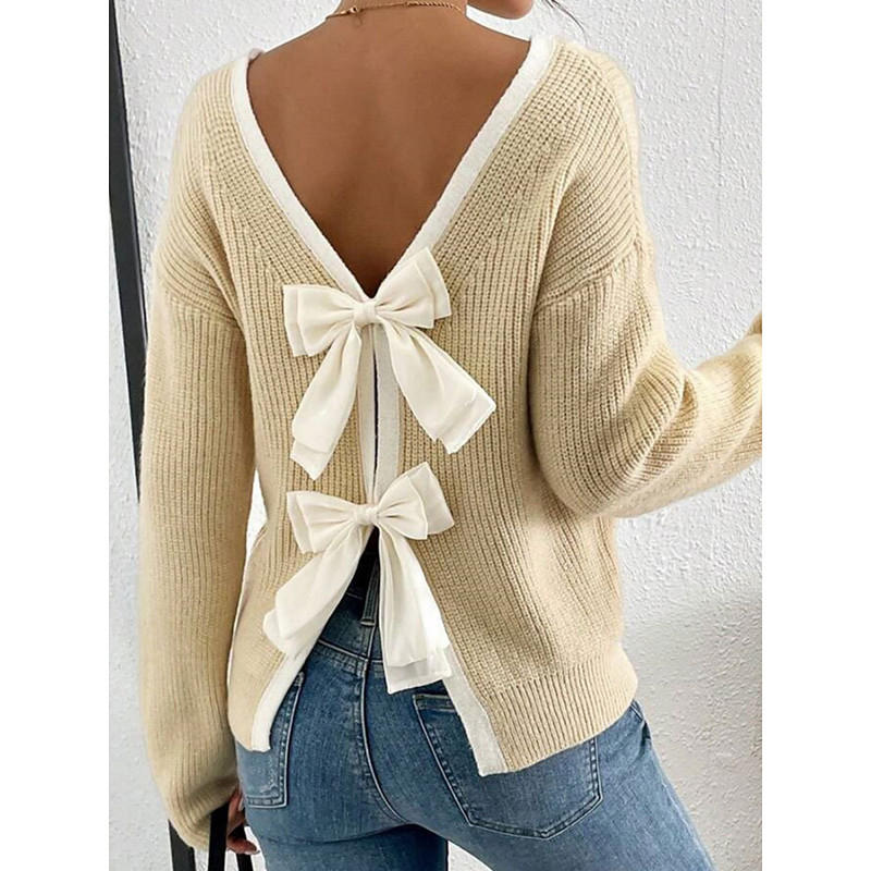 Women's Sweater Casual Soft Pure Color Ribbed V Neck Open Back Knitted Long Sleeve Regular Tops Knit Outdoor Daily Weekend Black Wine Fall Winter