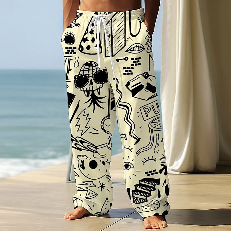 Men's Stick Figure Trousers Baggy Pants Casual Pants Mid Waist Vintage Retro Outdoor Vacation Streetwear Elastic Drawstring Waist Linen-Like Pants with Pockets Spring Fall 3D Print Black White Pink