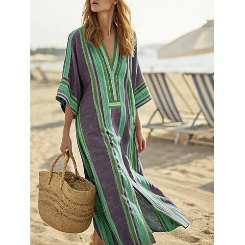 Per donna Abito lungo maxi Finto cotone e lino Vestito Casual Abito a trapezio Vintage Western Quotidiano Spiaggia Vacanza Vestibilità comoda A righe Manica 3/4 Scollo a V Blu Blu marino Viola Fucsia