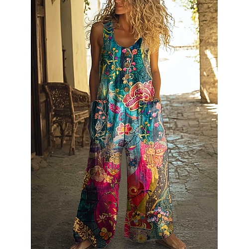 Per donna Tuta Attivo Floreale Senza Maniche Senza maniche Gamba larga Collo a U Tasca Bottoni Quotidiano Vacanza Vestibilità comoda Verde Estate