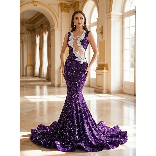 Sirena Tromba Strascico a Terra Abiti da Ballo Abito da Sera Da principessa Abito formale Festa Ritaglio Brillanti Senza Maniche Collo gioiello Balli di fine anno Festa serale Spandex Con Paillettes