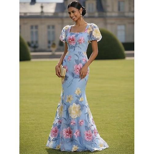 Sirena Tromba Lunghezza al pavimento Abito da Sera Vintage Floreale Manica Corta Scollo a V Festa serale Festa in giardino Organza Jacquard con Fiore ricamato