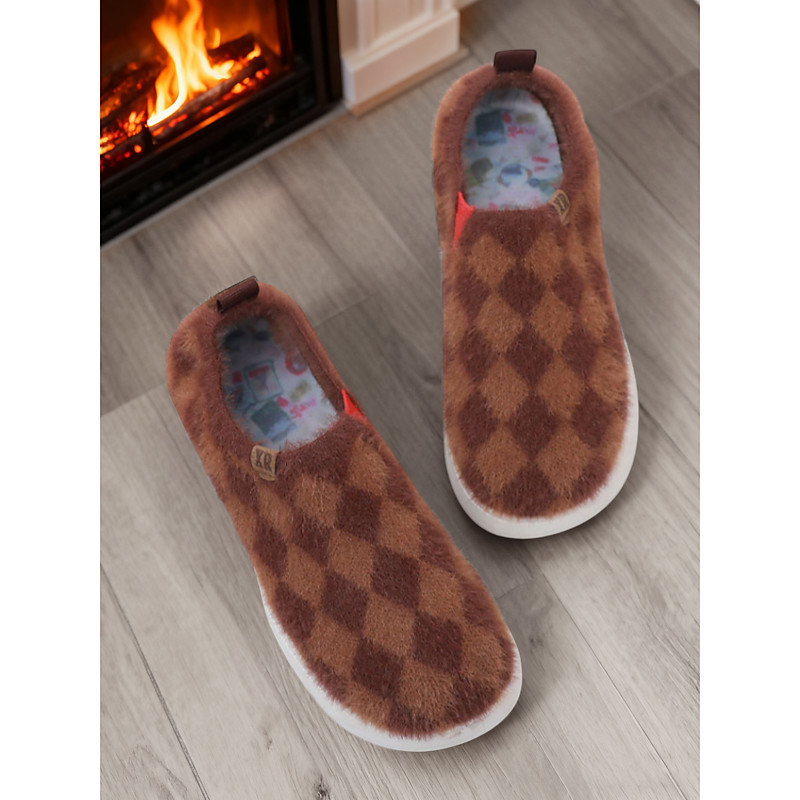 Women's Brown Cozy Wide-Fit Sneakers – Soft Fleece Lined Slip-On Shoes with Checkerboard Pattern, Comfortable and Stylish Footwear for Walking, Travel Daily Wear