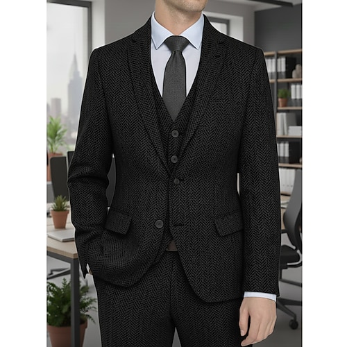 Uomo Affari Casuale Completi in Tweed Bavero classico Nero Grigio Quotidiano Affari Spina di Pesce Vestibilità su misura 3 pezzi Monopetto Due Bottoni