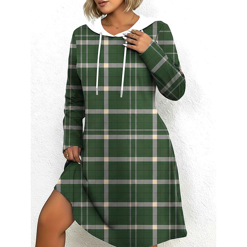 Natale Per donna Abito Midi Abito a trapezio Casual Quotidiano Vestibilità regolare Plaid Manica Lunga Con Cappuccio Nero Vino Verde militare Albicocca Primavera Autunno Inverno