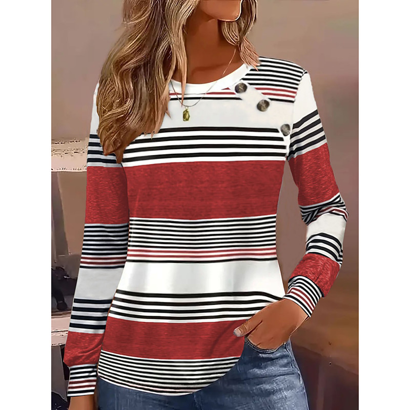 Women's Shirt Striped Stylish Casual Long Sleeve Crew Neck Regular Tops Daily Buttons Print Red Green Gray Spring Fall Prefall