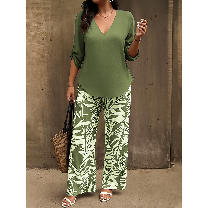 Women's Active Vacation Pants Sets Long Sleeve V Neck Leaves Print Casual Daily Black Pink Blue Spring Fall Regular Fit