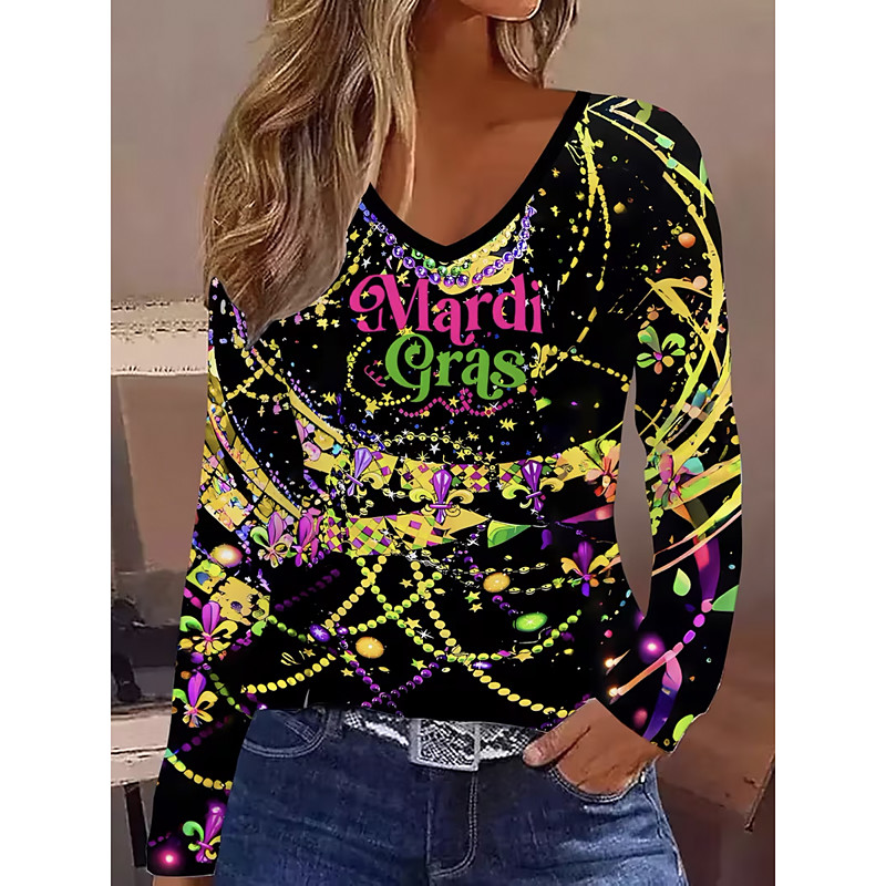 Carnival Women's T Shirt Graphic Abstract Vintage Stylish Classic Long Sleeve V Neck Regular Tops Daily Print Black Spring Fall