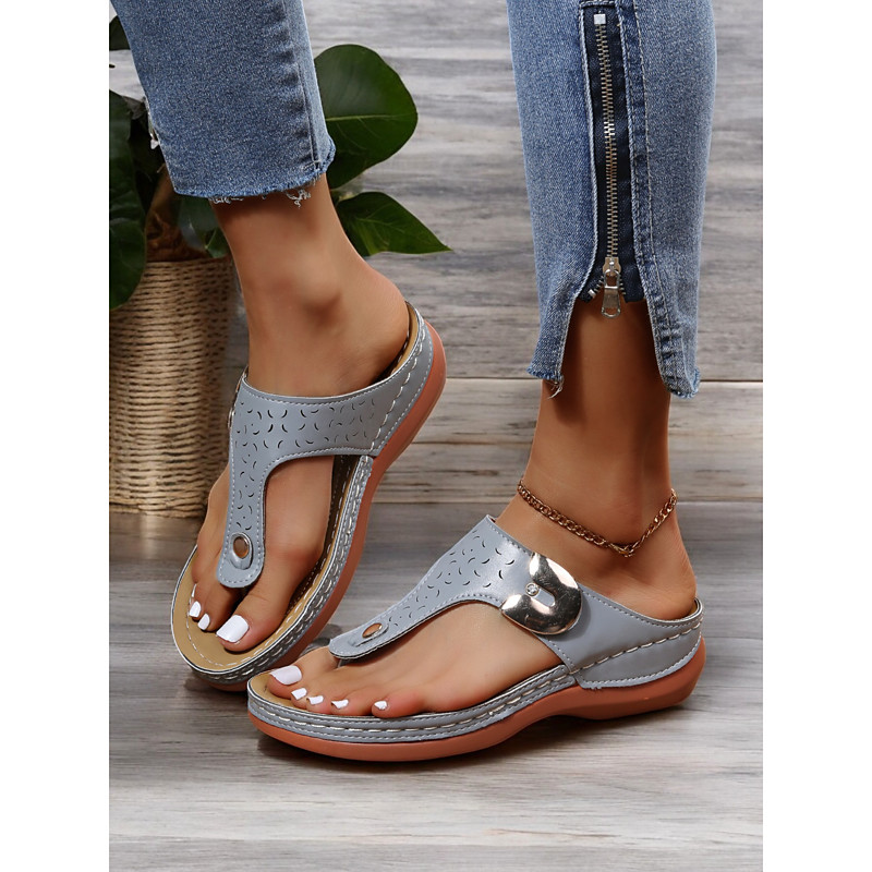 Women's Brown Faux Leather Flip-Flop Sandals with Perforated Design and Metallic Accent for Casual Wear and Summer Outings