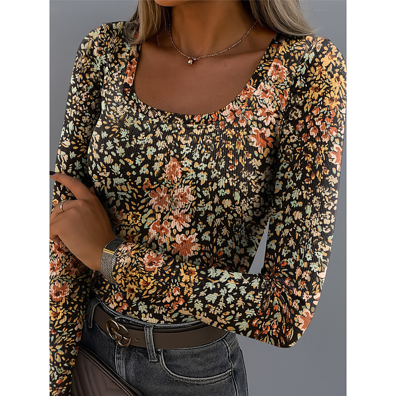 Women's T shirt Long Sleeve Ribbed Graphic Square Neck Long Sleeve Casual Floral Plants Vintage Stylish Regular Tops Daily Print Black White Yellow Light Green Purple Spring Fall Prefall