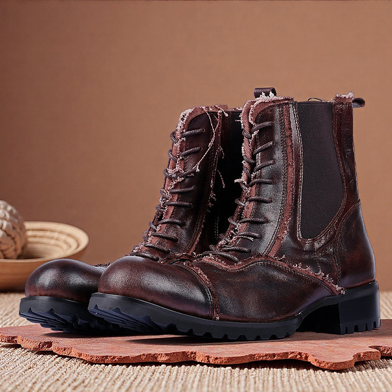 Men's Brown Leather Work Boots – Vintage Cowhide Lace-Up Ankle Shoes with Rugged Sole for Construction, Outdoor Adventure and Casual Daily Wear