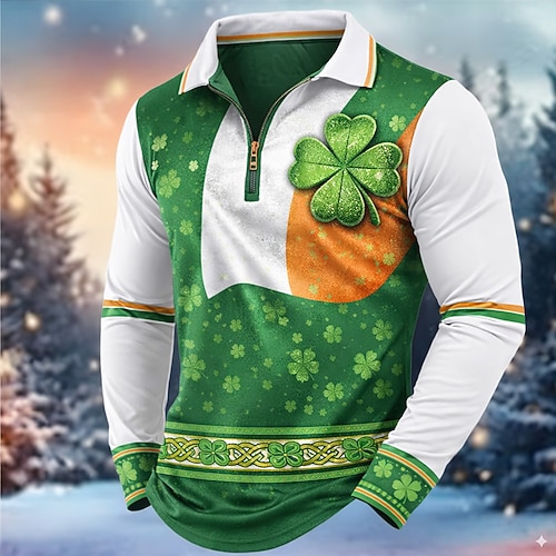 Giorno di San Patrizio Per uomo Quadrifoglio Polo Manica Lunga Collo ripiegato Moderno Tempo libero Vacanza Casual Quotidiano Festival Cerniera Stampa 3D Primavera Autunno Verde