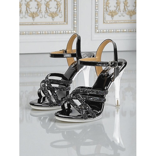 sandali rossi da donna con cinturino e tacco alto trasparente - scarpe eleganti e scintillanti per le feste di Capodanno e per le festività serata fuori