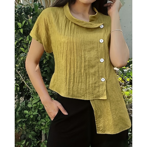 Per donna Camicie di cotone e lino Blusa Semplice Elegante Vintage Manica Corta Collo Alto Top Regolari Quotidiano Ferie Uscire Bottoni Orlo asimmetrico Giallo Estate Primavera