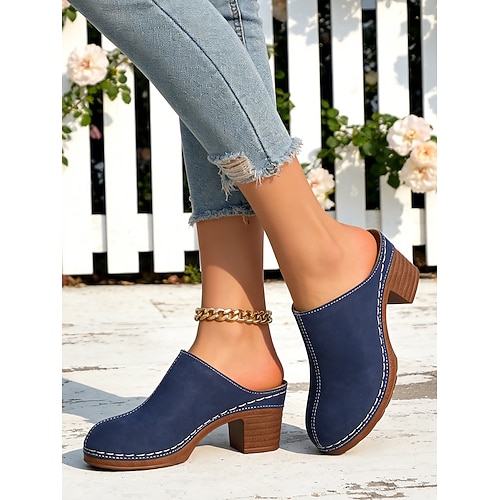Blaue, lässige Gartenclogs für Damen, bequeme Slipper mit Blockabsatz für Gartenarbeit und Freizeit auf dem Land. Alltagskleidung
