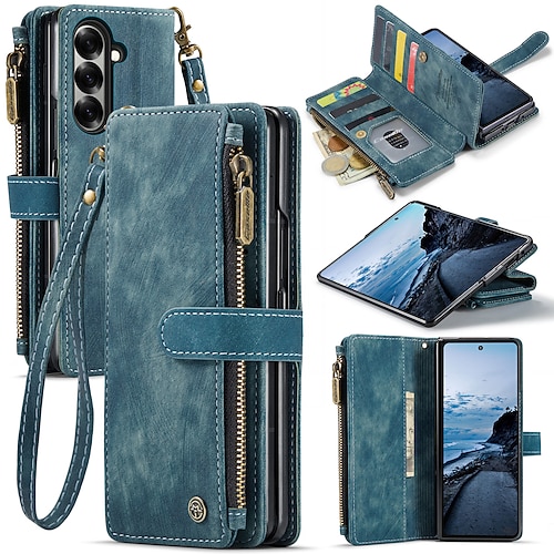 telefono Custodia Per Samsung Galaxy Piegatura a Z 7 Z Fold 6 Z Fold 5 Z Fold 4 Custodia Portafoglio Cerniera Con Cinturino da Polso Slot per Carte Retrò PC Pelle PU