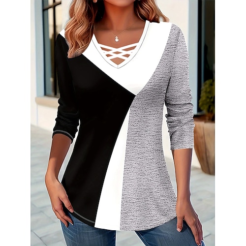 Per donna Maglietta Grafico Blocco di colori Geometria Vintage Elegante Classico Manica Lunga Scollo a V Top Regolari Quotidiano Taglio Stampato Bianco e nero Autunno Inverno