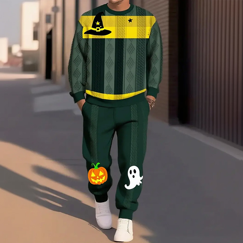 Halloween Men's Pumpkin Striped 2pcs 3D Sweatshirt Sets Tracksuit Pullover Sweatshirt Long Sleeve Long pants Crew Neck Sporty Casual Festival 3D Print Spring Fall Winter Green