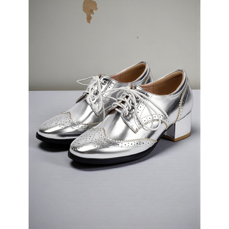 Women's Metallic Silver Brogue Shoes – Classic Lace-Up Oxfords with Perforated Detailing, Stylish Footwear for Work, Casual Outings and Special Occasions