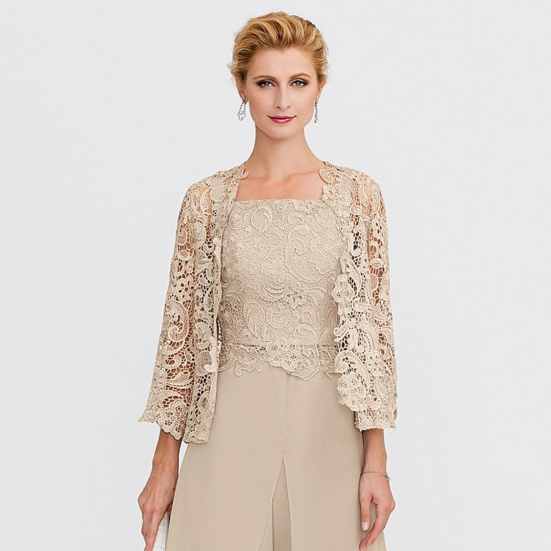 Two Piece A-Line Floor Length Wedding Guest Dress Mother of the Bride Dress 3/4 Length Sleeve Square Neck Elegant Wedding Guest Engagement Party Chiffon Lace with Lace