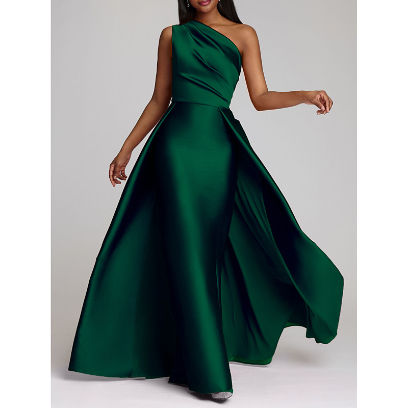 Sheath Column Floor Length Evening Gown Ball Gown with Overskirt Formal Dress Elegant Luxurious Sleeveless One Shoulder Wedding Guest Cocktail Party Satin with Overskirt Pure Color