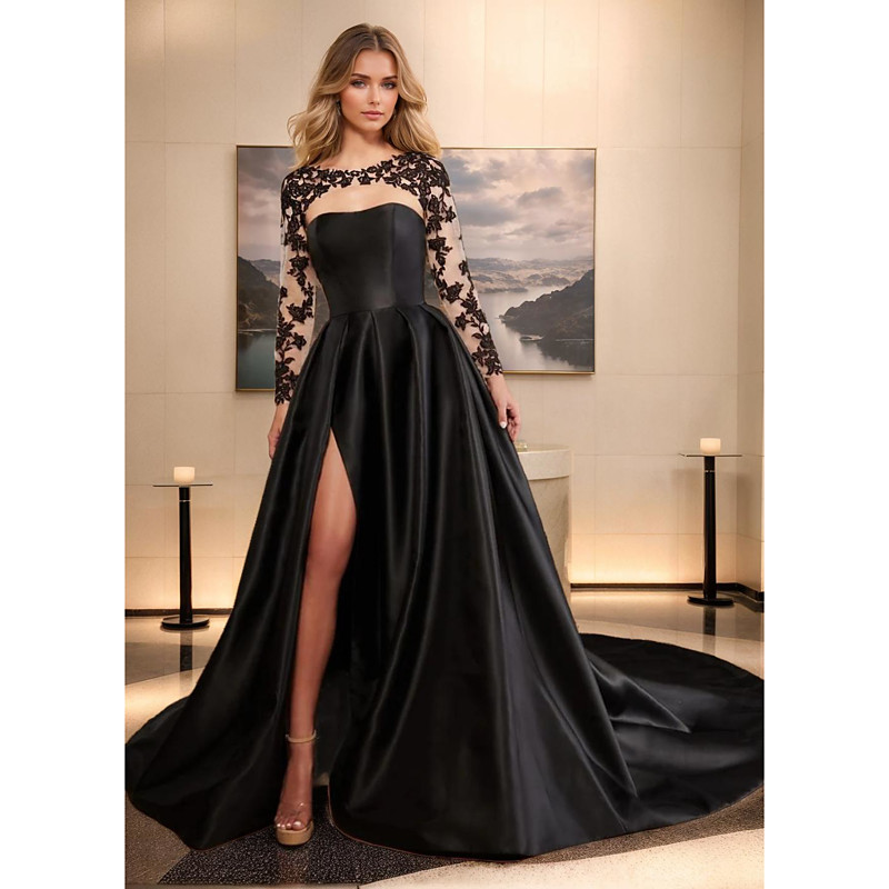 A-Line Floor Length Prom Dresses Evening Gown Ball Gown Formal Dress Elegant Glittering Silky Long Sleeve Jewel Neck Valentine's Day Christmas Satin with Ruffles Slit