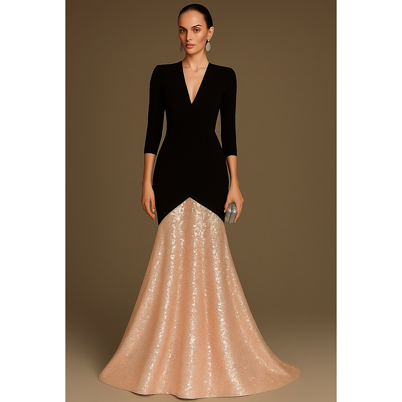 Mermaid Trumpet Floor Length Prom Dresses Evening Gown Ball Gown Formal Dress Elegant Color Block Black Dress 3/4 Length Sleeve V Neck Wedding Formal Sequined Stretch Crepe with Pleats
