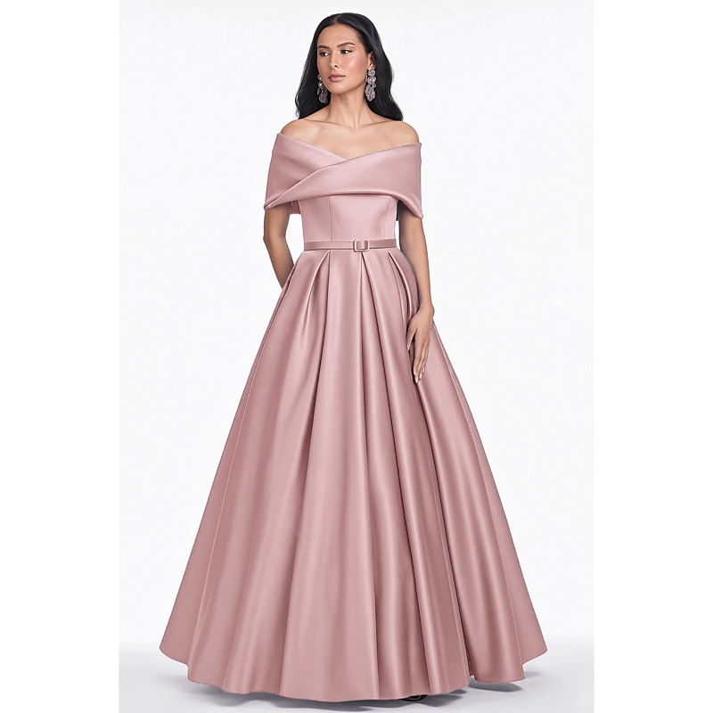 A-Line Floor Length Evening Gown Ball Gown Formal Dress Elegant Vintage Silky Short Sleeve Off Shoulder Wedding Formal Pocket Satin with Pocket