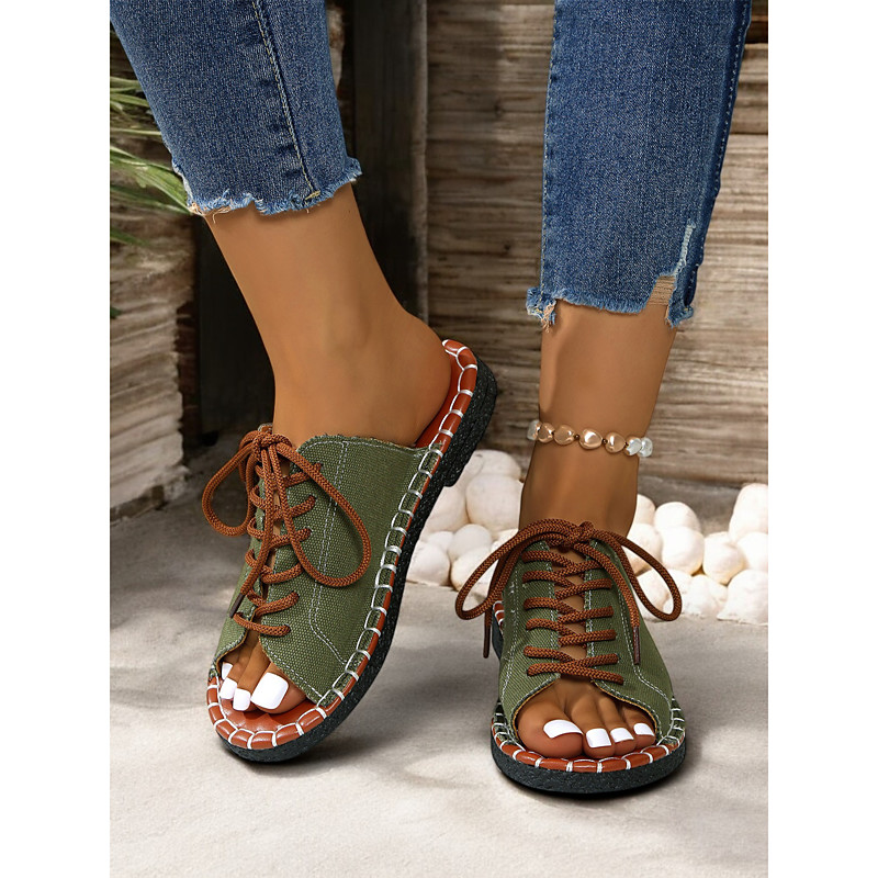 Women's Green Open-Toe Lace-Up Canvas Sandals with Hand-Stitched Sole – Casual and Comfortable for Summer, Travel and Outdoor Activities