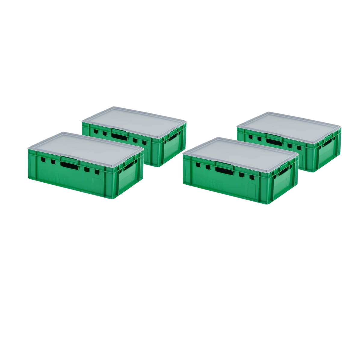 4 Stück Grün E2 Kisten 600x400x200 mm Fleischkasten Lagerkiste Metzgerkiste mit 4 grauen Deckeln