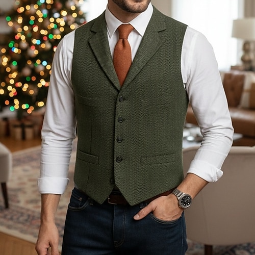 Da uomo Gilet Formale Matrimonio Natale Vacanza Moda Lussuoso Primavera Autunno Tasca Bottoni Lana Acrilico Confortevole Semplice Spina di Pesce Monopetto Bavero Vestibilità regolare Nero Champagne