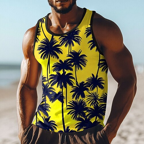 Canotta da uomo, canottiera intima, senza maniche, scollo a U, estate, vibrante giallo nero, palme, grafica, stampa su tutta la superficie, spiaggia tropicale, vacanza, moda, strada, casual, sportivo,