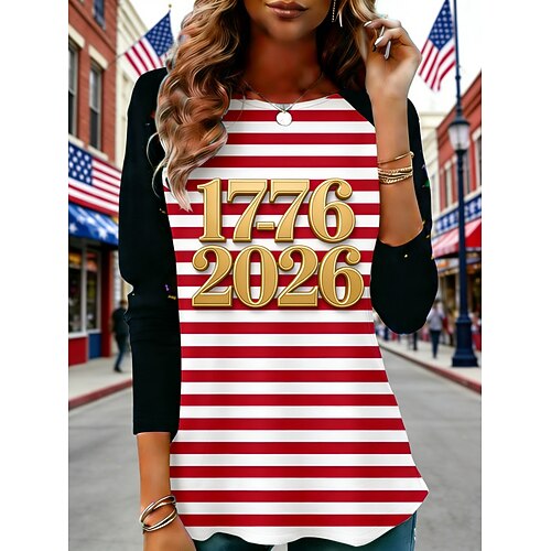 Amerikanischer Unabhängigkeitstag Damen T Shirt T-Shirt Grafik Gestreift Mode Stilvoll Klassisch Langarm Rundhalsausschnitt Normale Oberteile Täglich Wochenende Urlaubskleidung Druck Rote Frühling