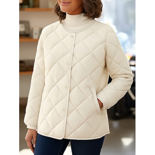 Damen Steppjacke Bequem Atmungsaktiv Tasche Knöpfe Lässig Einfach Urlaub Straße Lässig Alltagskleidung Einreihig Kurz Rundhalsausschnitt Normale Passform Langarm Oberbekleidung Schwarz Weiß Kaffee