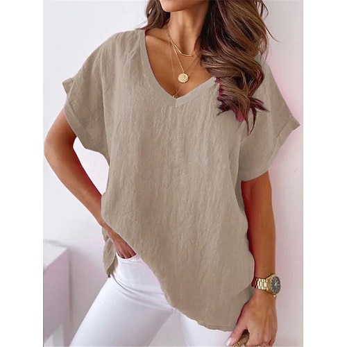 Per donna Camicie di cotone e lino Tinta unica Semplice Elegante Bohemien Vintage Manica Corta Scollo a V Top Regolari Quotidiano Blu Nero Bianco Rosa Kaki Estate Primavera Autunno Inverno