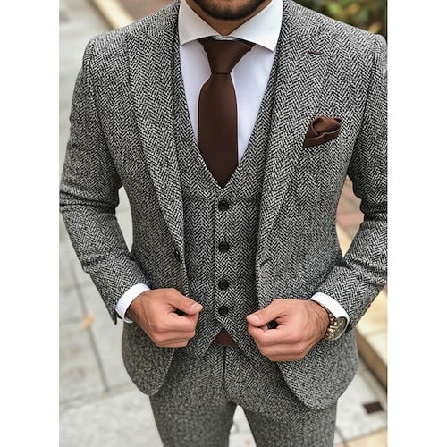 Uomo Matrimonio Affari Completi in Tweed Bavero a lancia Nero Grigio Formale Spina di Pesce Vestibilità su misura 3 pezzi Monopetto a un bottone