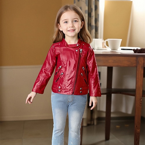 Bambini Ragazze Giacca in pelle nera Giacca di pelle Tinta unica Moda Cerniera Tasca Antivento All'aperto Cappotto Capispalla 4-12 Anni Autunno Nero Rosa Rosso