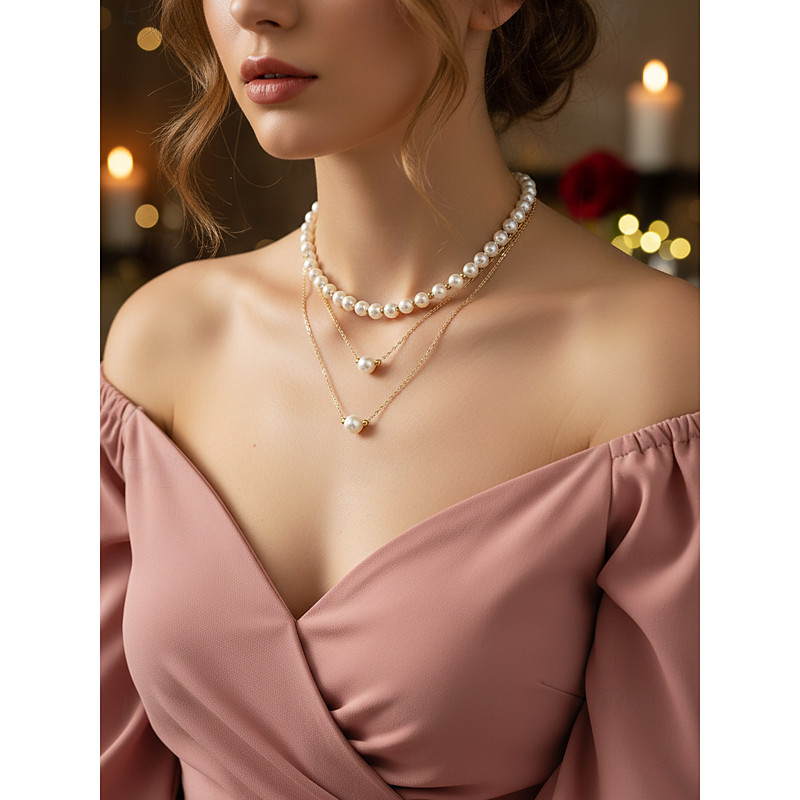 Women's Double Pearl Necklace for Valentine's Day – Timeless Classic Pearl Jewelry with Gold Chain, Perfect Gift for Loved Ones