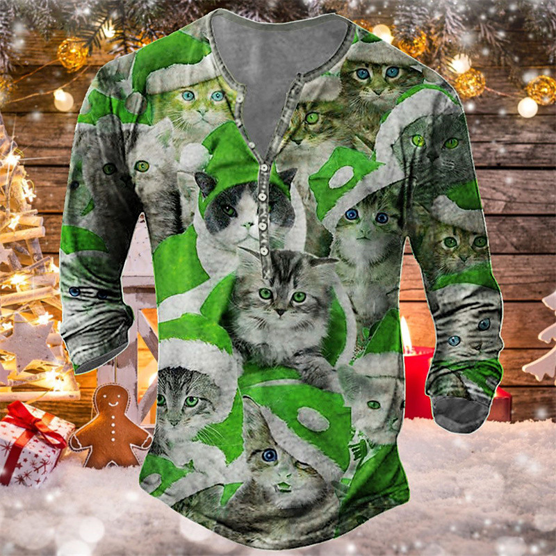 Christmas T Shirt Men's T shirt Tee Henley Shirt Tee Graphic Cat Henley Red Purple Orange Green 3D Print Outdoor Christmas Long Sleeve Button-Down Print Clothing Apparel Designer Basic Classic